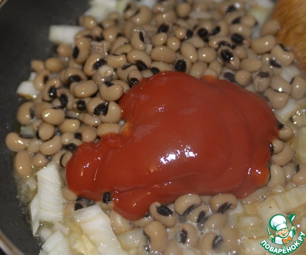 Кладём к луку фасоль и томатный кетчуп, перемешиваем и тушим на среднем огне 15 минут.