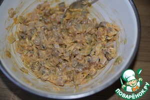 Добавляем по необходимости соль, заправляем салат майонезом, перемешиваем.