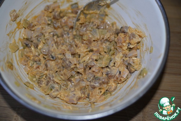 Для более презентабельной подачи и для фуршетного стола предлагаю подать этот салат в тарталетках из тостового хлеба.