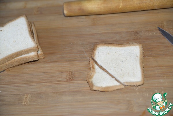 Берём тостовый хлеб. Если он не совсем свежий, рекомендую прогреть 10 секунд в микроволновке. Раскатываем тост из хлеба скалкой. Отрезаем уголок. -