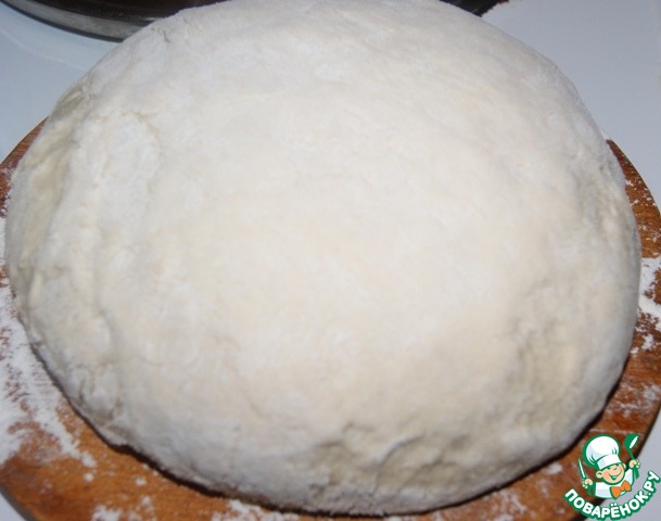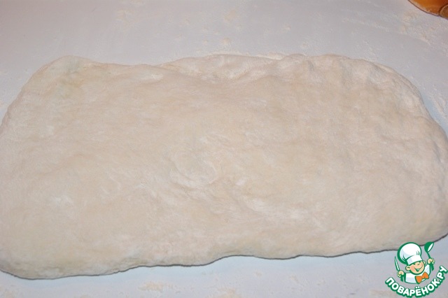 Руками разровнять тесто в прямоугольник. Присыпать мукой.