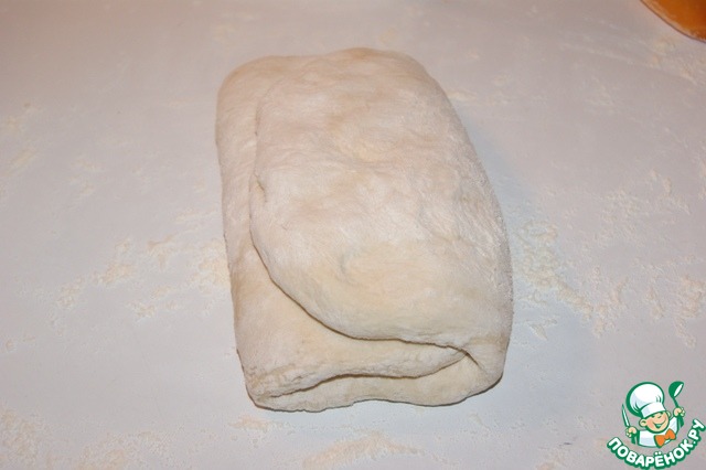 Руками расправить тесто в прямоугольник, присыпать мукой. С узкой стороны сложить тесто слева к середине, а потом справа накинуть на сложенную часть.
