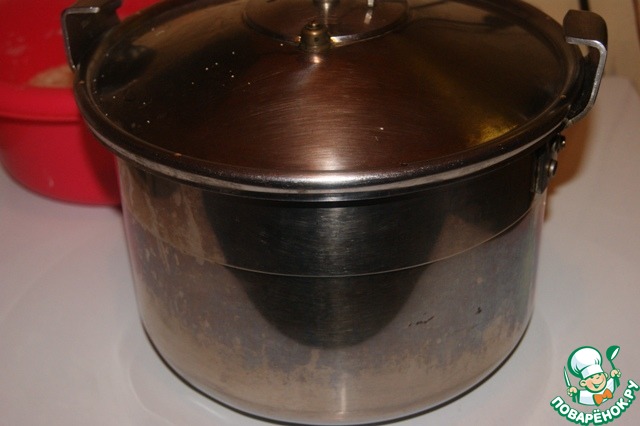 Включить духовку на 250"С. И поместить в нее кастрюлю с крышкой. Можно использовать специальную форму с крышкой, у меня старая скороварка без пластмассовых ручек и с толстым дном.