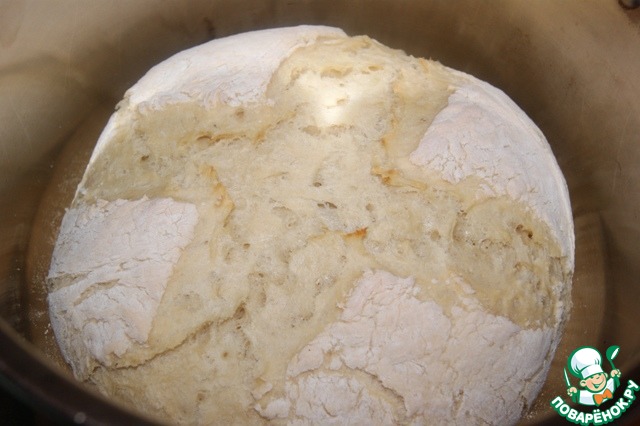 Не касаясь кастрюли на весу бросить в нее сформованный хлеб и очень острым ножом (кончиком) сделать Х образный надрез.