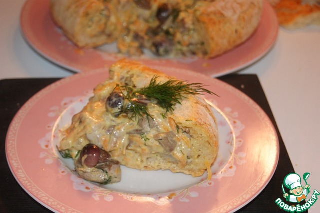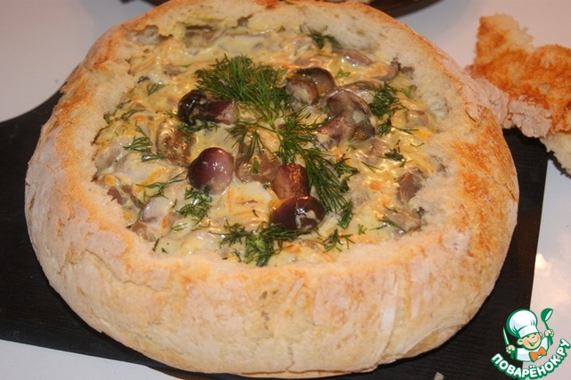 Заполнить грибами в соусе и так подавать. Хлебная корочка не размокает и "тарелка" очень хорошо держит форму!