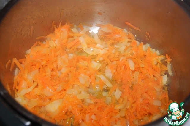Лук мелко нарезать, морковь натереть на крупную терку. И слегка протушить в сотейнике 2-3 минуты.