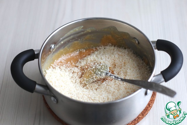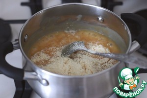 Далее добавить миндальную муку (30 гр.). При постоянном помещивании на медленном огне загустить смесь. Это произойдет примерно через 15-20 мин.