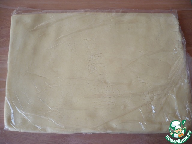 Заверните пищевую пленку и придайте тесту прямоугольную форму, раскатав его. Положите тесто на 10 минут в холодильник.
