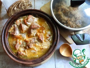 Накрыла промаринованное мясо в кеци фольгой и поставила в духовку на 1 час при т-200 С. -