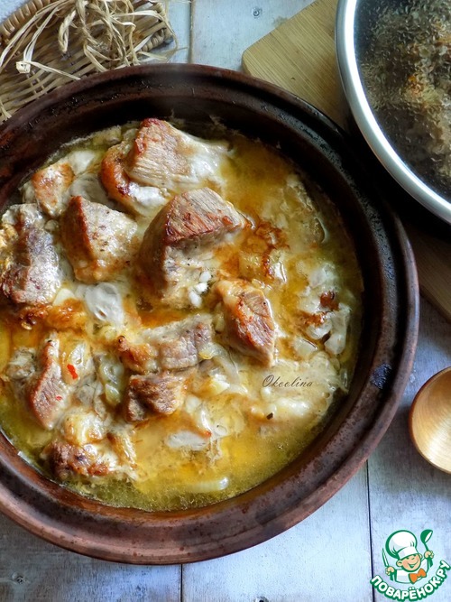 Томлённая свинина (окорок) кусочками, маринованная в пряных специях на кецы. Кеца-это грузинская сковорода из красной глины или камня, которую можно поставить и в духовку, и в печь. Если нет такой сковороды, то свинину можно сделать в любой другой глиняной посуде или керамической форме. Это очень ароматное мясо и несложное в приготовлении. Плюс, что оно готовится совершенно без масла и запекается в 100 % экологически чистой посуде.