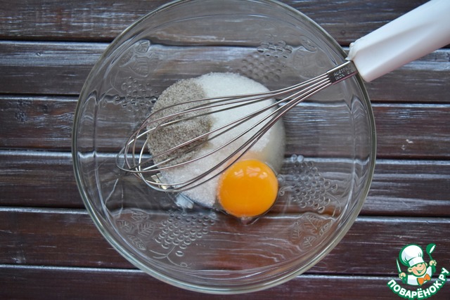 В миске соединить желток одного крупного куриного яйца, ванильный сахар и сахарный песок, растереть смесь венчиком.