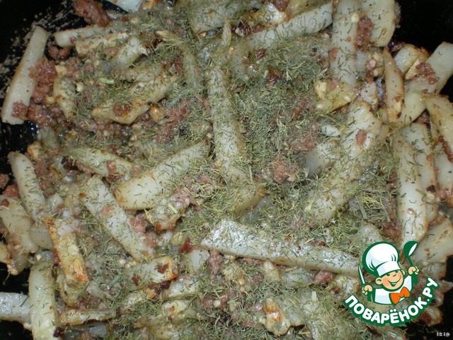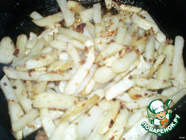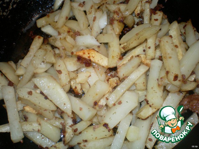 Выложить со сковородки фарш в миску, а на сковороде теперь обжарить картошку.