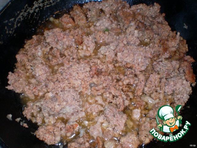 Фарш поджарить на растительносм масле. У меня было 3 котлеты, я их размяла вилкой