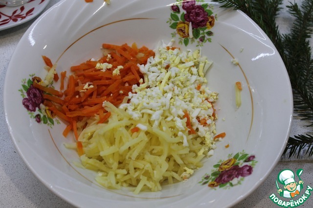 Для приготовления салата нужно воспользоваться тёркой для моркови по корейски. Аккуратно натереть картофель, яйцо и морковь.