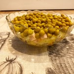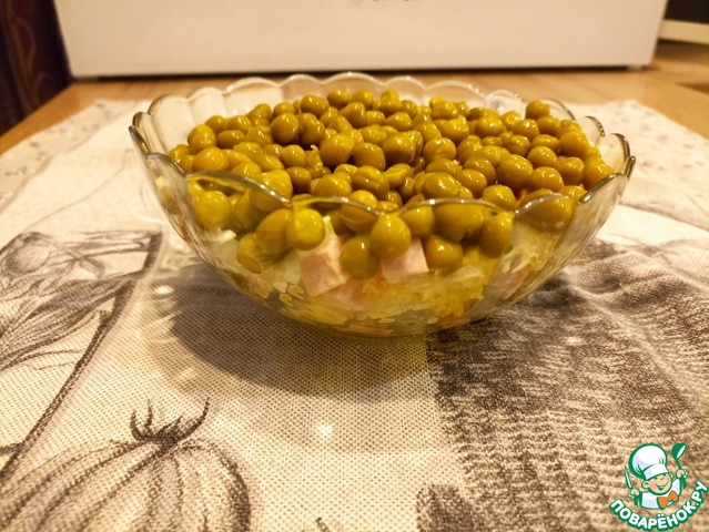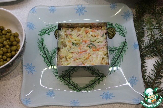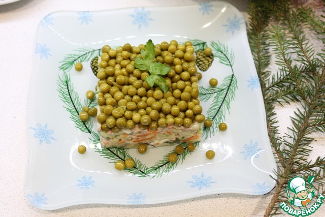 Сверху выложить горошек, убрать форму и украсить листиками петрушки.