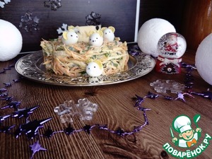 4. Из перепелиных яиц делаем мышек и украшаем ими салат.