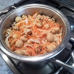 • 4. Затем выкладываем шампиньоны, морковь, лук и черный молотый перец перемешиваем. И ставим на медленный огонь ровно на 7 минут.