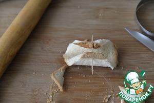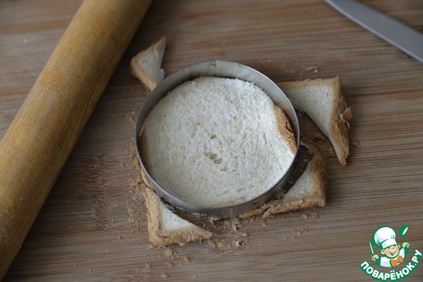Берём хлеб для тостов. Если он не совсем свежий, то слегка нагреваем в микроволновке, чтобы стал мягкий. Раскатываем скалкой и вырезаем круг.