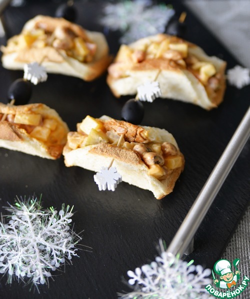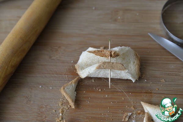 Скрепляем края тоста зубочисткой. Рекомендую не плотно соединять края, чтобы входило больше начинки (салата). Кладём заготовки тарталеток в форму и ставим в духовку, нагретую до 200 градусов, подсушить их на 10 минут.