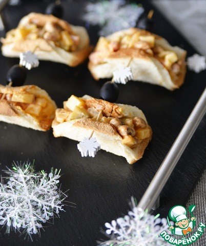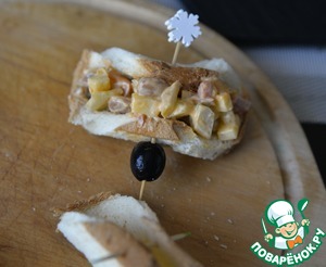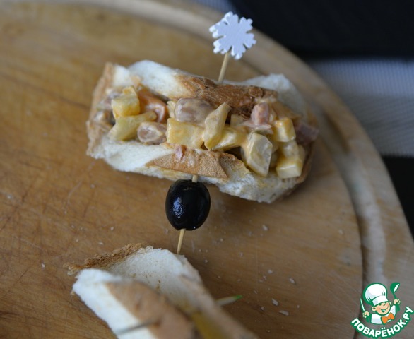 Готовым тарталеткам из хлеба даём остыть и начиняем их непосредственно перед подачей к столу салатом. На край зубочистки (шпажки) нанизываем маслину.
