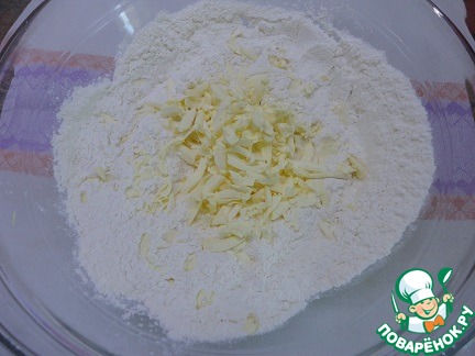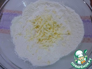 Для теста смешать муку с солью и разрыхлителем и натереть холодное масло на крупной терке. Быстро перетереть с мукой в крошку.
