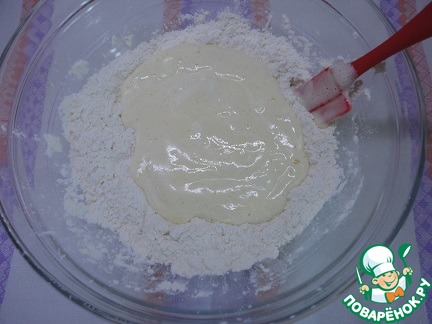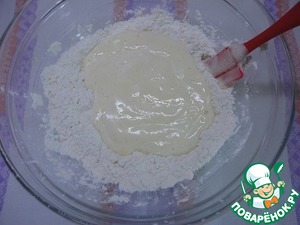 Вылить яично-сметанную массу к масляной крошке и быстро замесить тесто.