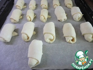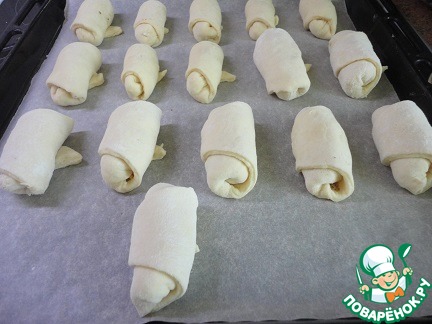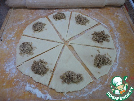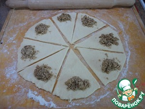 Разделить на две части и каждую раскатать в круг. Нарезать на сигменты. На широкий конец треугольника выложить 1 ч. л. орехов и завернуть в трубочку так, чтобы не было видно начинки. -
