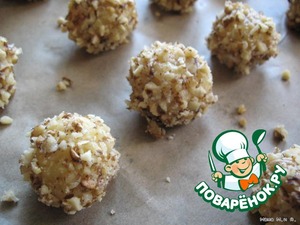 Из теста сформировать небольшие шарики (2 см в диаметре), каждый шарик обмакнуть в белке и затем в орехах. Положить шарики на расстоянии 2 см друг от друга на противень,