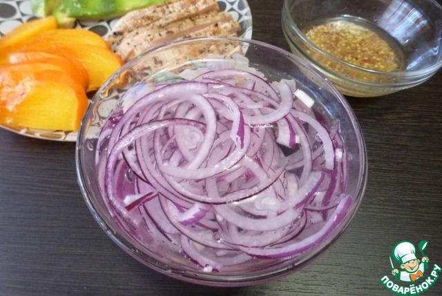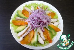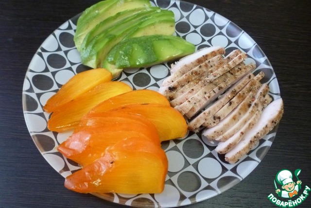 Авокадо, хурму и куриное филе аккуратно нарезать тонкими ломтиками. Авокадо желательно сбрызнуть соком лимона, чтобы он не потемнел.