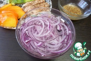 Лук нарезать тоненькими полукольцами и залить очень холодной водой. Лук станет упругим и уйдет лишняя горечь.