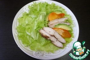 Листья салата нарвать кусочками и положить на сервировочную тарелку. Выкладывать чередуя между собой ломтики авокадо, хурмы и куриного мяса.