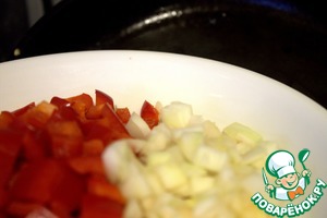 Нарезать мелким кубиком перец и лук.