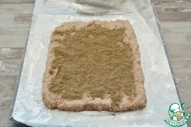 На листе фольги разложите фарш слоем 1 см, обильно посыпьте его черным молотым перцем ( у меня ушло около 1 ст. л.)