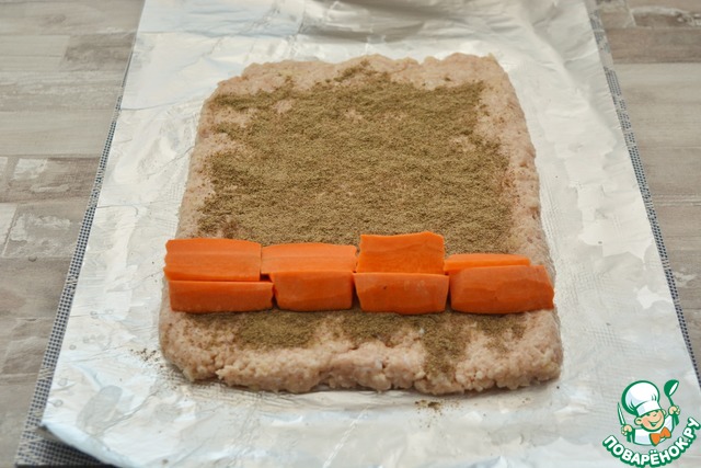 На один край положите морковь. Если морковка тонкая, то лучше целиком. У меня была крупная, поэтому я ее порезала. Морковь лучше слегка отварить (до полу-готовности), сырая морковь может не успеть приготовиться