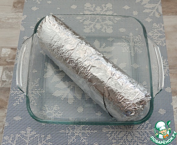 Сверните аккуратно рулетом, заверните в 2 слоя фольги поместите в какую-либо форму. Готовьте в духовке, медленно поднимая температуру с 50-60 до 120-150°С. Готовится около 2 часов.