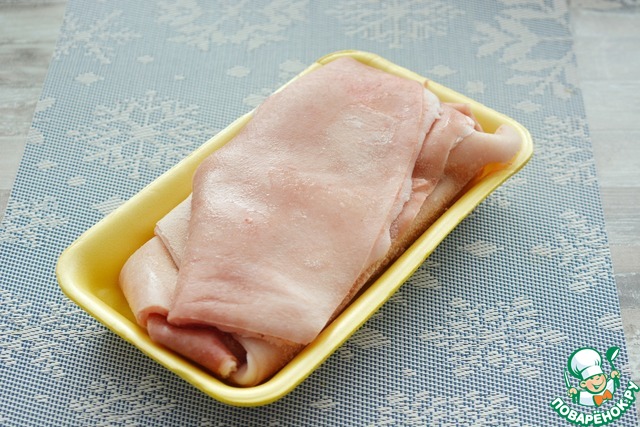 Свиную шкуру залейте водой и сварите (без соли) до мягкости (около 1,5-2 часов). Остудите полностью. Вода для варки шкуры в ингредиентах не указана, заливайте так, чтобы едва покрыло.