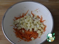 Картофель чистим, режем кубиками, кладём к моркови. |