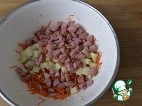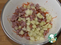Добавляем резанную кубиками варено-копчёную колбасу. |