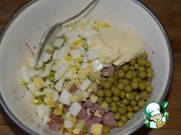 Кладём порезанные кубиками яйца, горошек, майонез. Всё перемешиваем. |