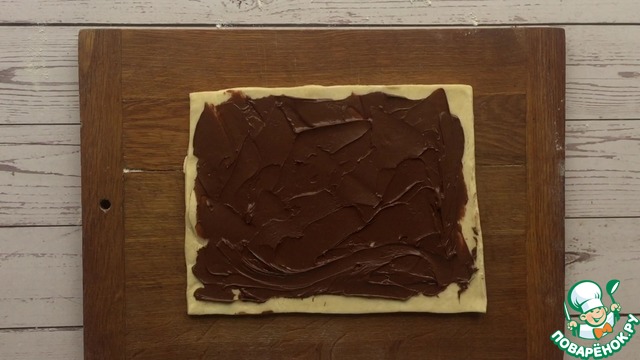 Дальше отрезаем от того же слоеного теста прямоугольник и намазываем его целиком орехово-шоколадной пастой, оставляя с каждого края по 0,5 см.