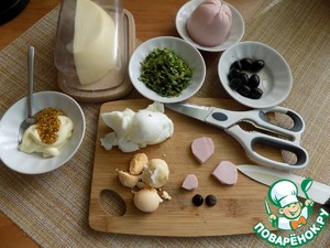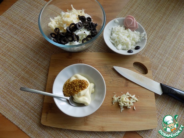 Продукты в салат очень мелко режем. А это: колбаса, петрушка, маслины, 2 желтка и один белок, сыр натираем на средней тёрке и всё складываем в общий салатник. Я в салате использую козий сыр. Его очень люблю. Кто не ест такой, то замените на любой твёрдый сыр, вами любимый! Делаем заправку. В майонез добавляем горчицу и мелко порубленный чеснок. Соединяем. Оставшийся белок натираем на тёрке.