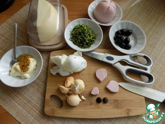 Готовим продукты для салата. Яйца варим вкрутую. Отделяем белки от желтков, так как нам нужна белая мышь, то верх салата мы присыпим натёртыми белками. Из продуктов они самые белые. Отрезаем очень тонкий кусочек колбасы и кухонными ножницами из него вырезаем для мордочки мыши носик и два уха, из маслины - два глаза одинакового размера.