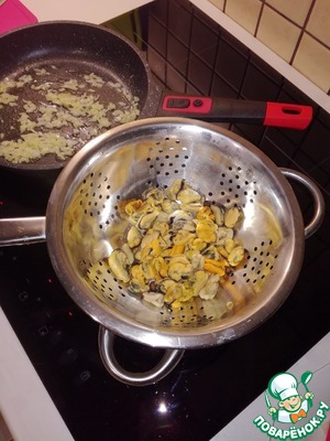И так, вода закипела, добавляем в нее мидий. Кстати, это главная "фишка", я пробовал пропускать этот этап и выкладывать мидии сразу на сковороду, получается гораздо хуже.