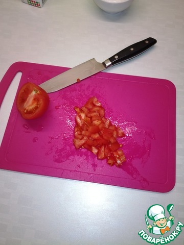Чистим помидор от кожицы и мелко режем. Половина у меня осталась.