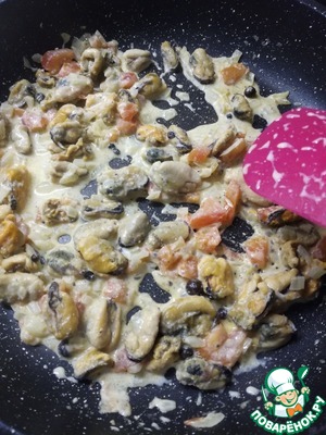Добавляем наши мидии и сливки. Сливки должны примерно на 1/3-1/2 покрывать мидии.