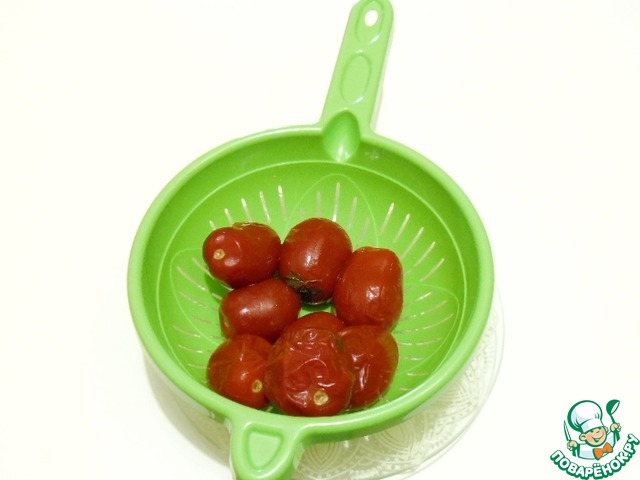 Помидоры вынуть из рассола, очистить и оставить в дуршлаге, чтобы немного стекли.