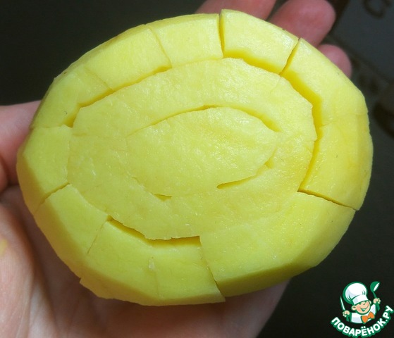 По кругу разрезать картошку, не дорезая до самого низа примерно 1 см. Держать при этом нож ровно, не под наклоном, иначе серединка картофеля выпадет. Сделать несколько таких кругов. У меня картофель среднего размера, получилось сделать 2 круга. Если картофель крупный, то можно и 3 круга вырезать. -