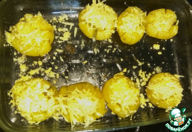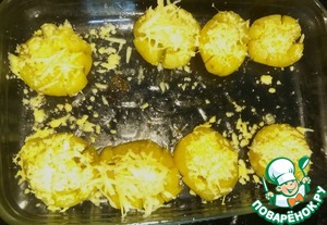 Полить готовый картофель маслом с чесноком. Посыпать натертым сыром и поставить в духовку еще на 5 минут.