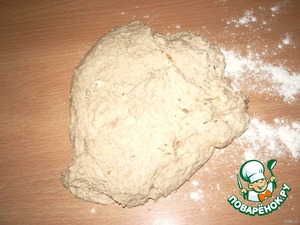 Положил в ведро хлебопечки и налил 300мл кефира. После того, как хлеб размок, размешал в однородную массу. Взял грамм 10 дрожжей, добавил немного теплой воды, чл сахара, размешал. Всыпал в ведро 800мл муки, чл соли, стол. ложку сахара, чл тмина. За это время дрожжи дали шапку, вылил все это тоже в ведро. Включил на режим тесто, печка начала перемешивать, тесто показалось жидковатым, добавил еще 100 мл муки. В результате это выглядело так -