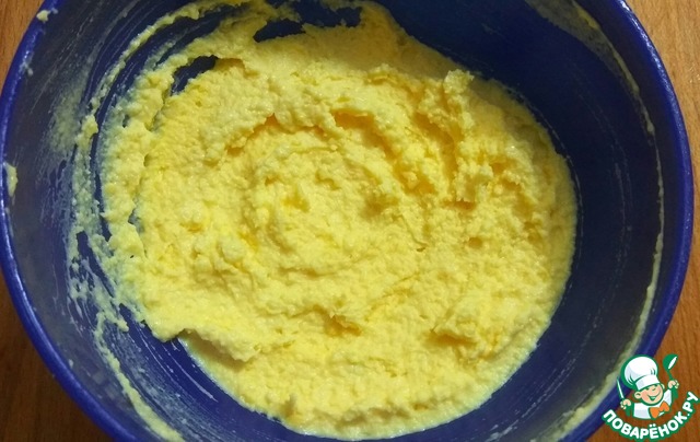 Желток рязмять вилкой, добавить половину натертого на мелкой тёрке сыра, майонез и горчицу. Перемешать. При необходимости немного посолить. -